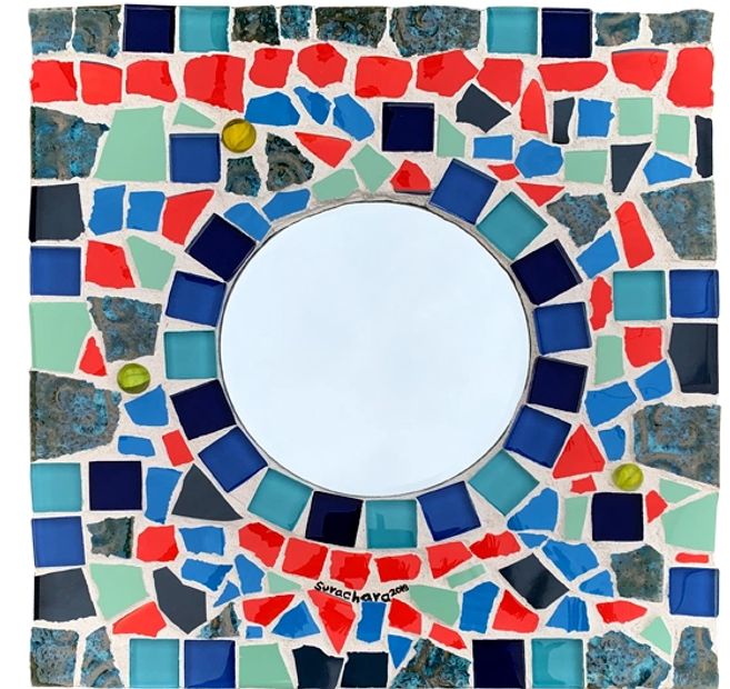 Handmade rectangle tiled mosaic mirror on wood.